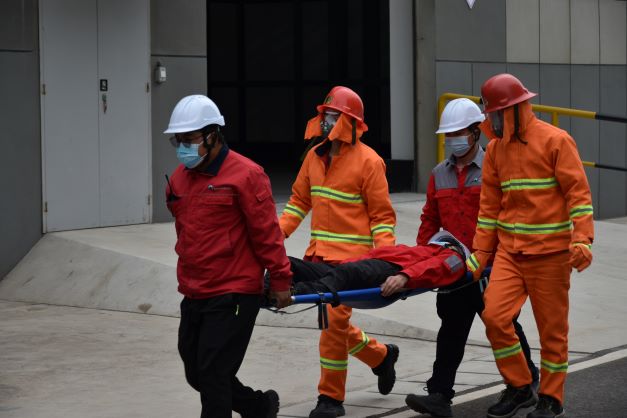 消防演練正式開始,李總宣布啟動(dòng)“環(huán)保消防應(yīng)急預(yù)案演習(xí)”,接到2#倉(cāng)庫(kù)火情報(bào)警信息后,立即啟動(dòng)應(yīng)急預(yù)案,各小組按應(yīng)急預(yù)案快速投入滅火、救治等工作中。通訊與警戒組現(xiàn)場(chǎng)進(jìn)行調(diào)度、警戒,并對(duì)火災(zāi)現(xiàn)場(chǎng)進(jìn)行封鎖。醫(yī)療救護(hù)組對(duì)傷員進(jìn)行轉(zhuǎn)移、臨時(shí)急救。搶險(xiǎn)搶修組身著滅火服對(duì)著火點(diǎn)實(shí)施滅火。